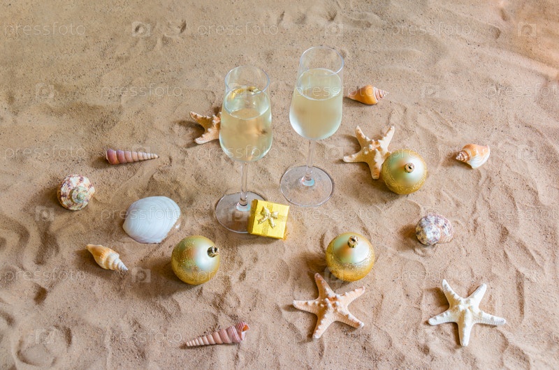 Бокалы для шампанского, рождественские шары и подарок на пляже. Празднование Рождества и Нового года