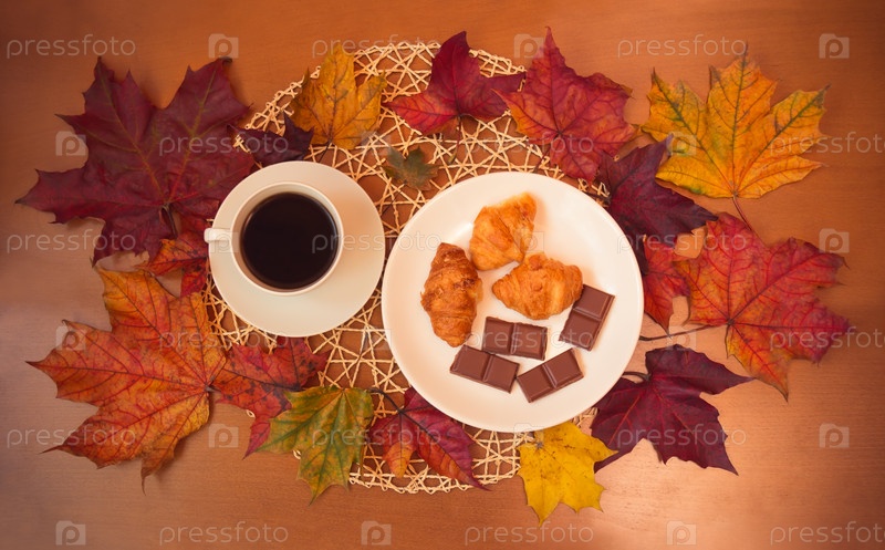 Суп из кофе, шоколада, кроассантов и осенних кленовых листьев на деревянном столе