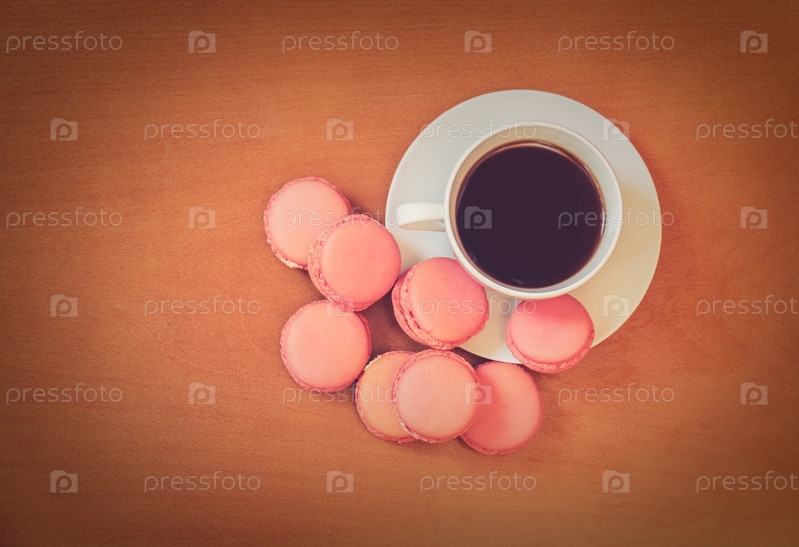 Чашка кофе с французскими розовыми миндальными печеньями. Вид сверху с местом для копирования