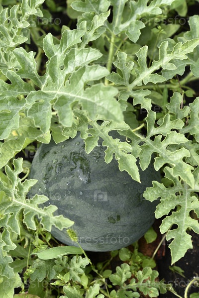 Зеленый спелый арбуз на кусте в саду. Плоды арбуза в каплях дождя летом