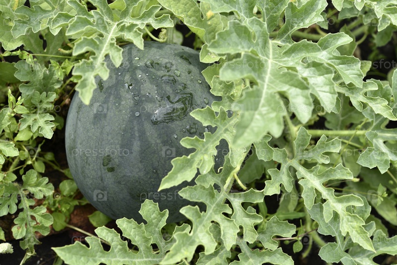Зеленый спелый арбуз на кусте в саду. Плоды арбуза в каплях дождя летом
