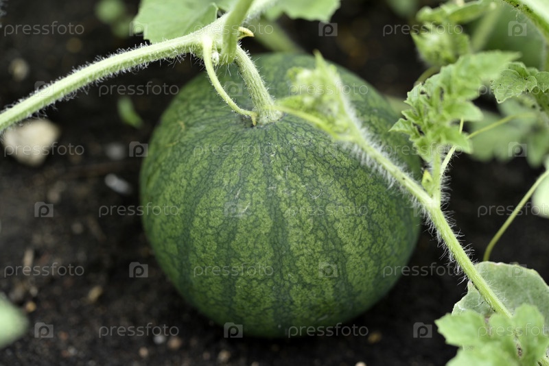 Зеленый спелый арбуз на кусте в саду. Плоды арбуза в каплях дождя летом