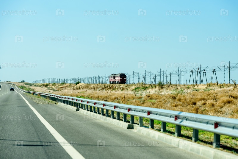 Россия, Крым, 11 сентября 2019 г.: Автомобили на шоссе в Крым. Железная дорога и локомотив