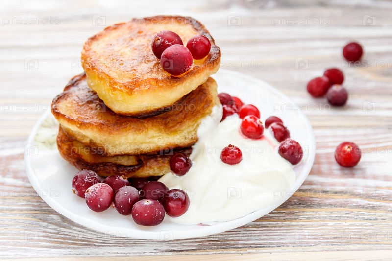Блинчики с ягодами и сметаной на тарелке. Дача русских деликатесов