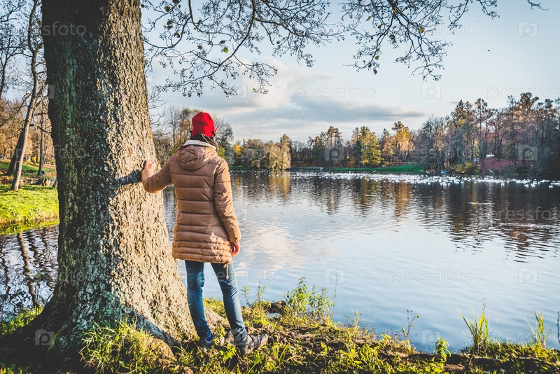 Девушка в красной шляпе в наушниках наслаждается видом осеннего парка