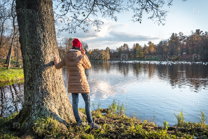 Девушка в красной шляпе в наушниках наслаждается видом осеннего парка. Вид сзади