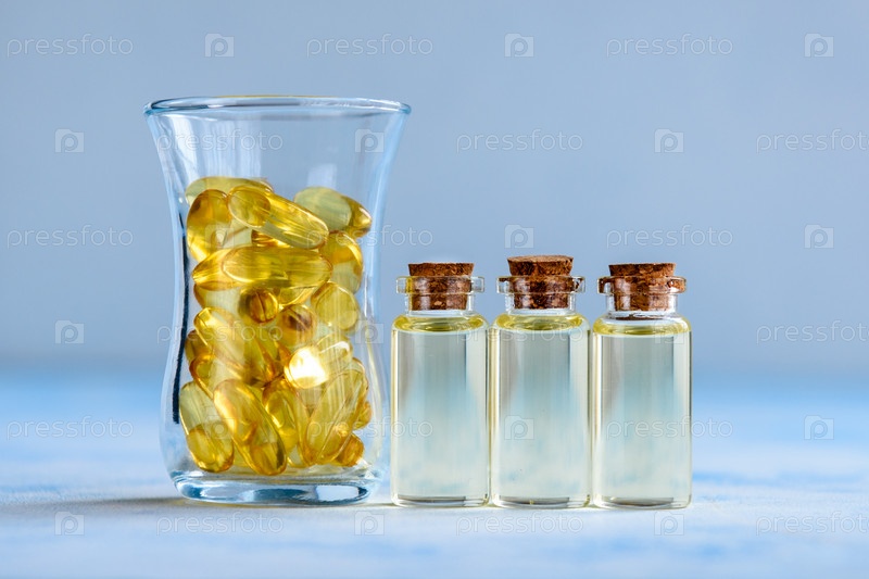 Капсулы рыбьего жира на синем фоне - витамины омега-3 и концепция здоровья