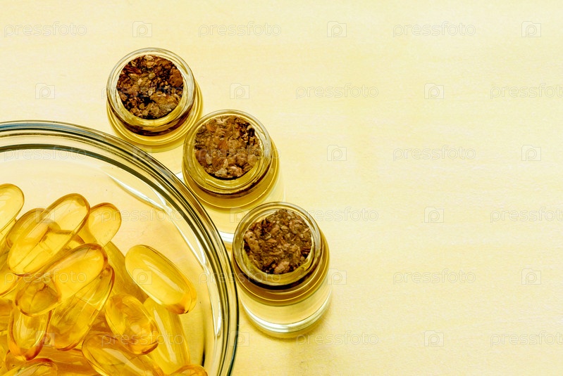 Капсулы с золотым рыбьим жиром на желтом фоне - концепция здоровья и натуральных морских витаминов