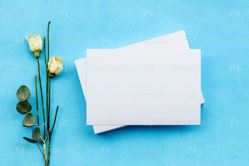 Белые пустые карточки и желтые сушеные розы на синем фоне. Нежная романтическая заготовка для открытки