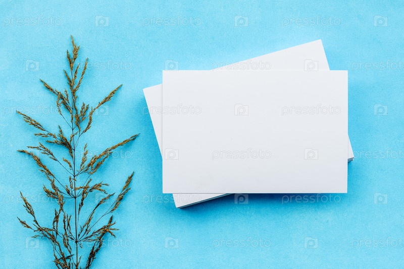Белые пустые карточки и сухие ветки растений на синем фоне. Нежная романтическая заготовка для открытки. Приглашение на свадьбу и место для копирования, вид сверху