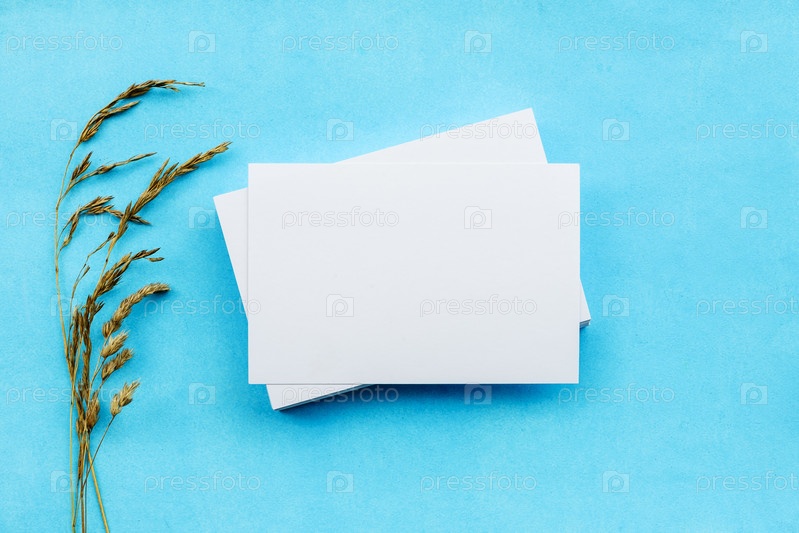 Белые пустые карточки и сухие ветки растений на синем фоне. Нежная романтическая заготовка для открытки. Приглашение на свадьбу и место для копирования, вид сверху