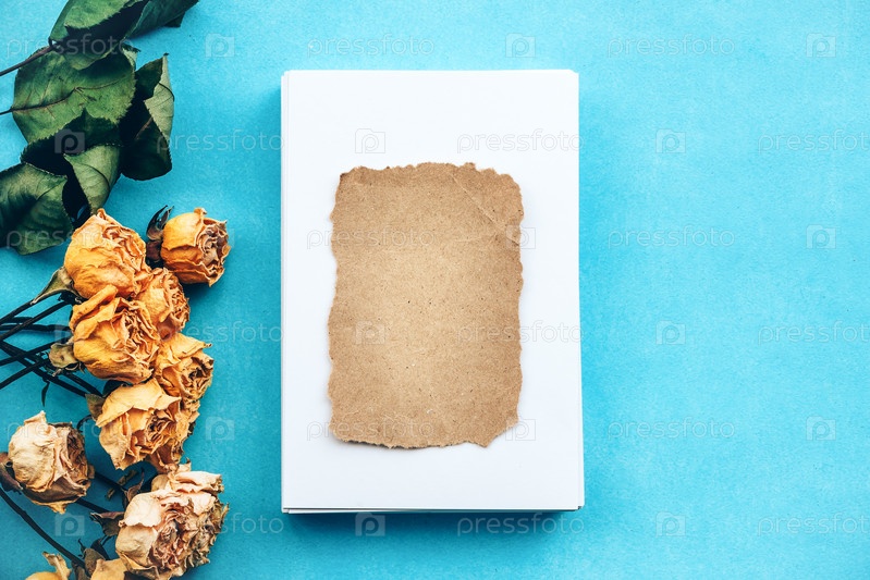 Белые пустые карточки и желтые сушеные розы на синем фоне. Нежная романтическая заготовка для открытки