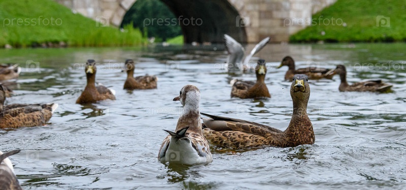 Многие утки в озере плавают в летнем парке