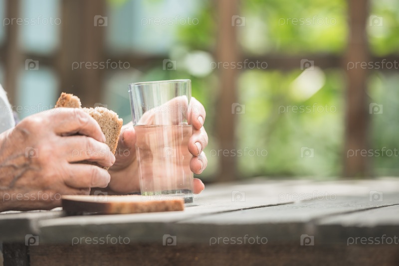 Руки бабушки держат стакан и хлеб на деревянном столе