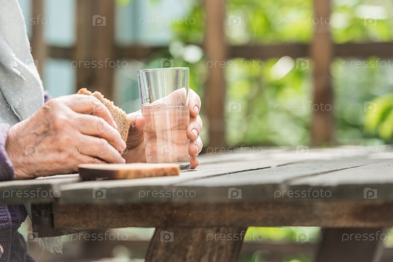 Руки бабушки держат стакан и хлеб на деревянном столе