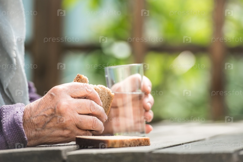 Руки бабушки держат стакан и хлеб на деревянном столе