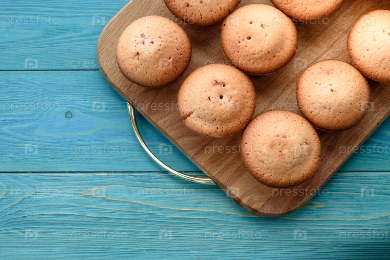 Свежие кексы на разделочной доске на деревянном синем фоне. Фон. Текстура свежеиспеченной булочки. Крупный план. Макрос