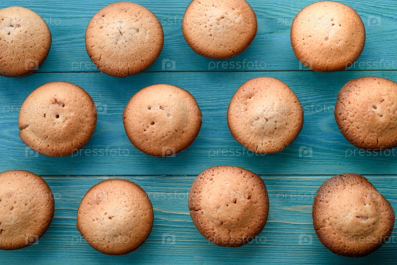Свежие кексы на разделочной доске на деревянном синем фоне. Фон. Текстура свежеиспеченной булочки. Крупный план. Макрос