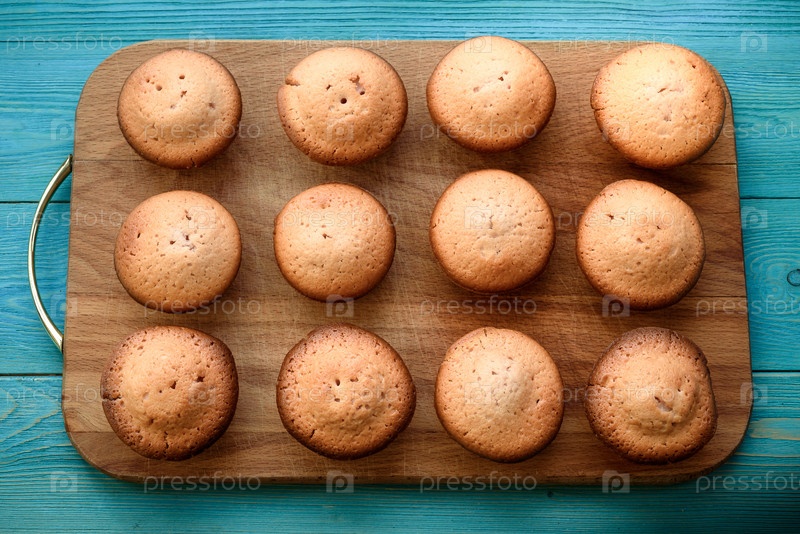 Свежие кексы на разделочной доске на деревянном синем фоне. Фон