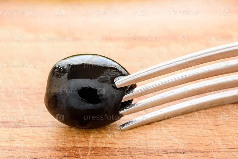 Черные оливки One Berry на вилке, крупный план