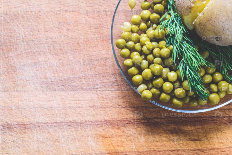 Вареный картофель, зеленый горошек и зелень на деревянной доске