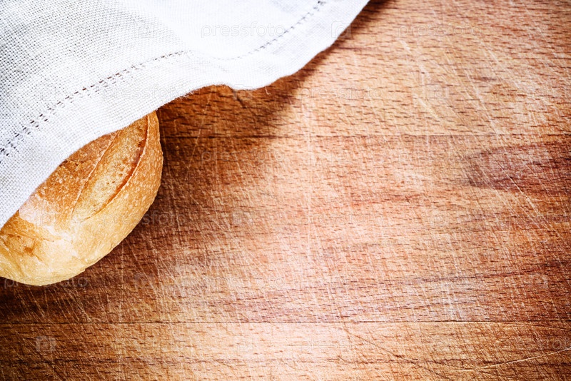 Свежий хлеб, покрытый льняной салфеткой, поверх дерева