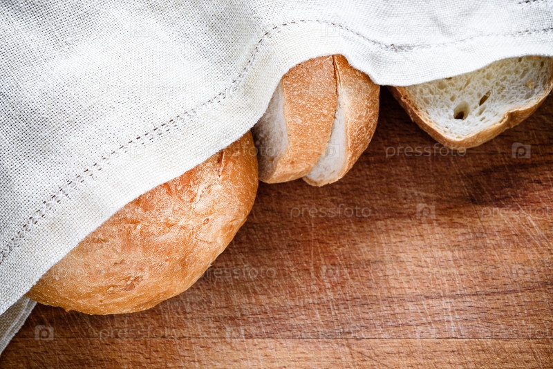 Свежий хлеб под льняной салфеткой на деревянной салфеткеСвежий хлеб под льняной салфеткой на деревянной
