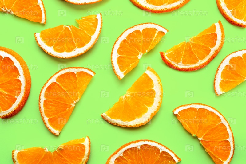 Фруктовый узор из ломтиков свежего апельсина на зеленом фоне
