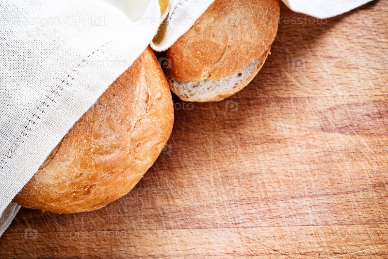 Свежий хлеб под льняной салфеткой на деревянном столе