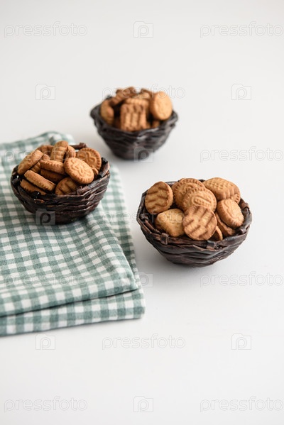 Маленькое крекерное печенье в корзине на льняной салфетке на белом фоне