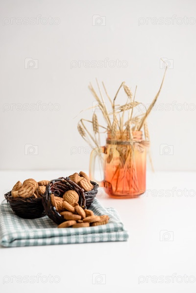 Маленькое крекерное печенье в корзине на льняной салфетке на белом фоне