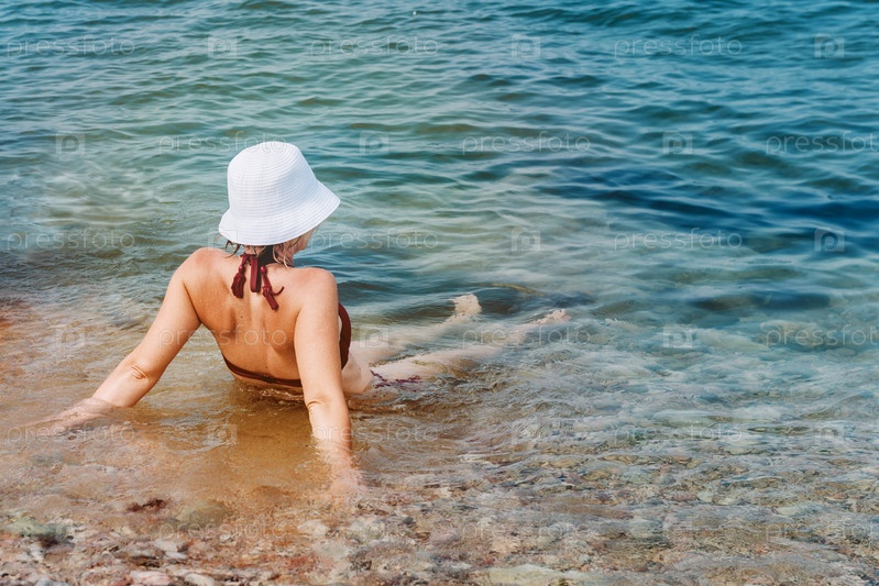 Море, пляж, волны и молодая женщина — концепция пляжного отдыха летом. Женщина в купальнике сидит в морской воде на мелком дне