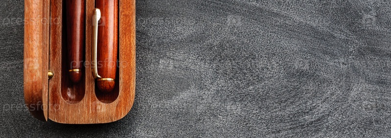 Офисные винтажные ручки-паркеры на черном фоне. Винтажный баннер в офисном стиле на темном фоне и пространстве для копирования