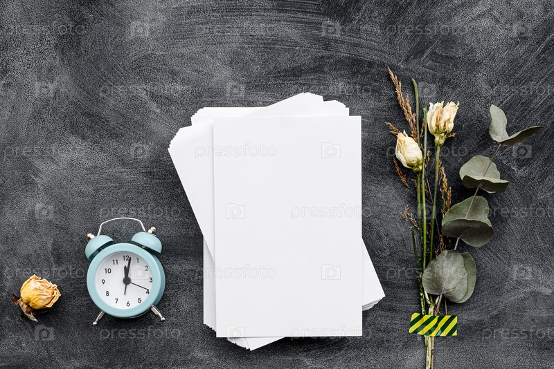 Модный фон канцелярских товаров на черном - блокнот, наклейки, будильник и цветы