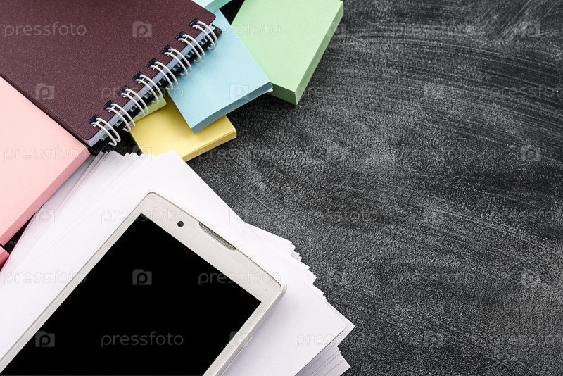 Вид сверху на офисный стол с канцелярскими принадлежностями на черном фоне