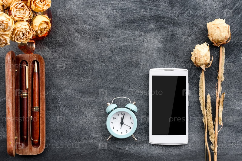 Модный фон канцелярских товаров на черном смартфоне, ручках Parker и сухих цветах