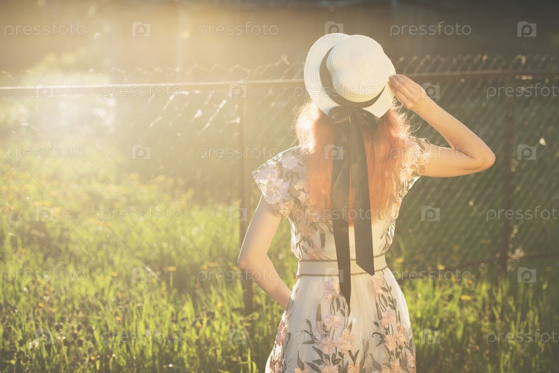 Девушка в шляпе и с длинными волосами на закате - концепция солнечного света и вида сзади