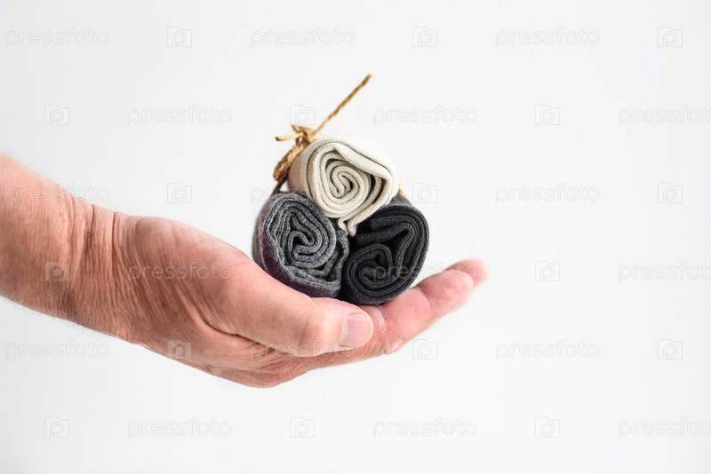 Мужские носки в ладонях на белом фоне — крупный план