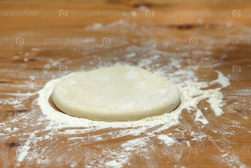 Тесто для пиццы. Основа для выпечки пиццы на деревянном столе, крупный план
