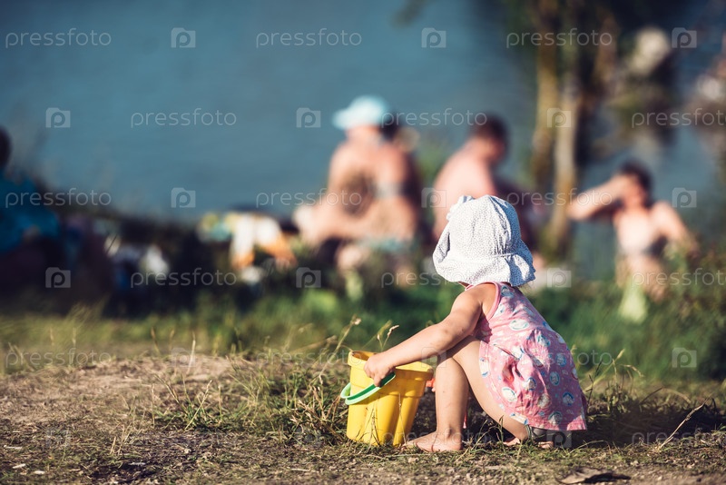 Россия, Санкт-Петербург, 24 июня 2020 г.: Маленькая девочка в розовом платье играет в песке на берегу озера