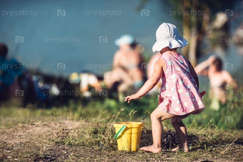 Россия, Санкт-Петербург, 24 июня 2020 г.: Маленькая девочка в розовом платье играет в песке на берегу озера