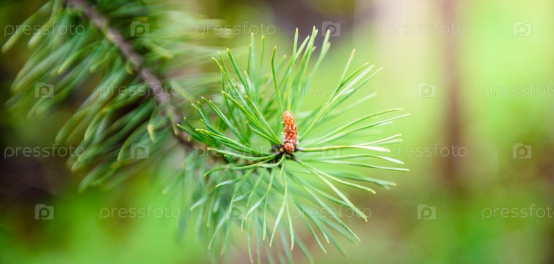 Ветка хвойного дерева с иголками крупным планом - солнечный свет. Панорамный вид