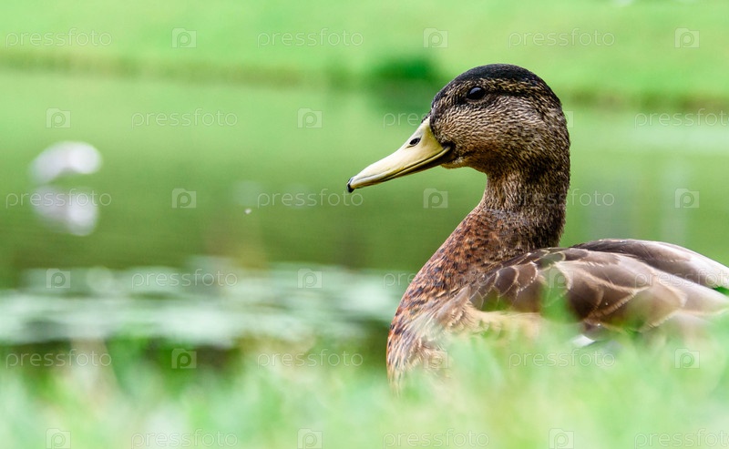 Серая утка ходит по зеленой траве у воды крупным планом