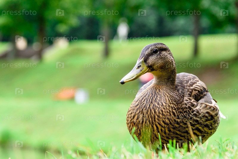 Серая утка ходит по зеленой траве у воды крупным планом