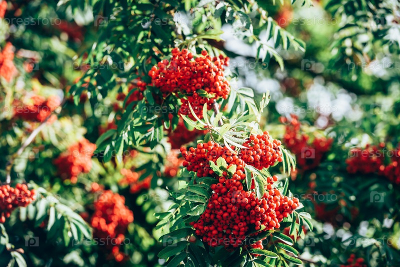 Ветка с красными осенними ягодами Роуэн. Естественный осенний фон
