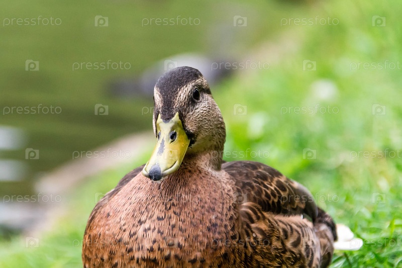 Серая утка на камне возле воды летом в парке крупным планом