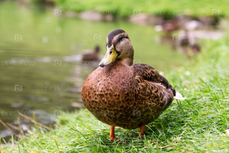 Серая утка на камне возле воды летом в парке крупным планом