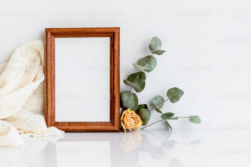 Деревянная фоторамка с веточкой эвкалипта и желтой розой на белом деревянном столе. Минималистичная, нежная планировка. Заготовка для открытки