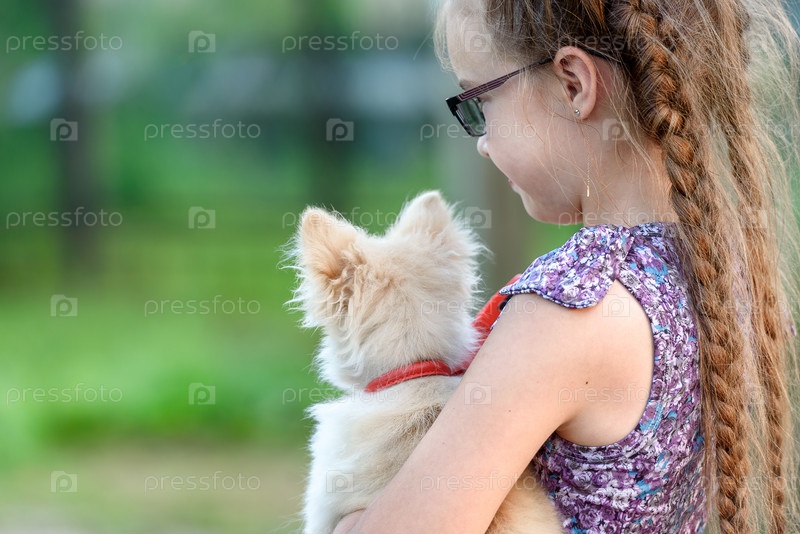 Девушка с собачкой на плече, вид сзади