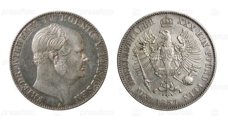 Старая прусская монета талер с изображением Фридриха Вильгельма 4. Монета 1857 года. изолированный на белом фоне